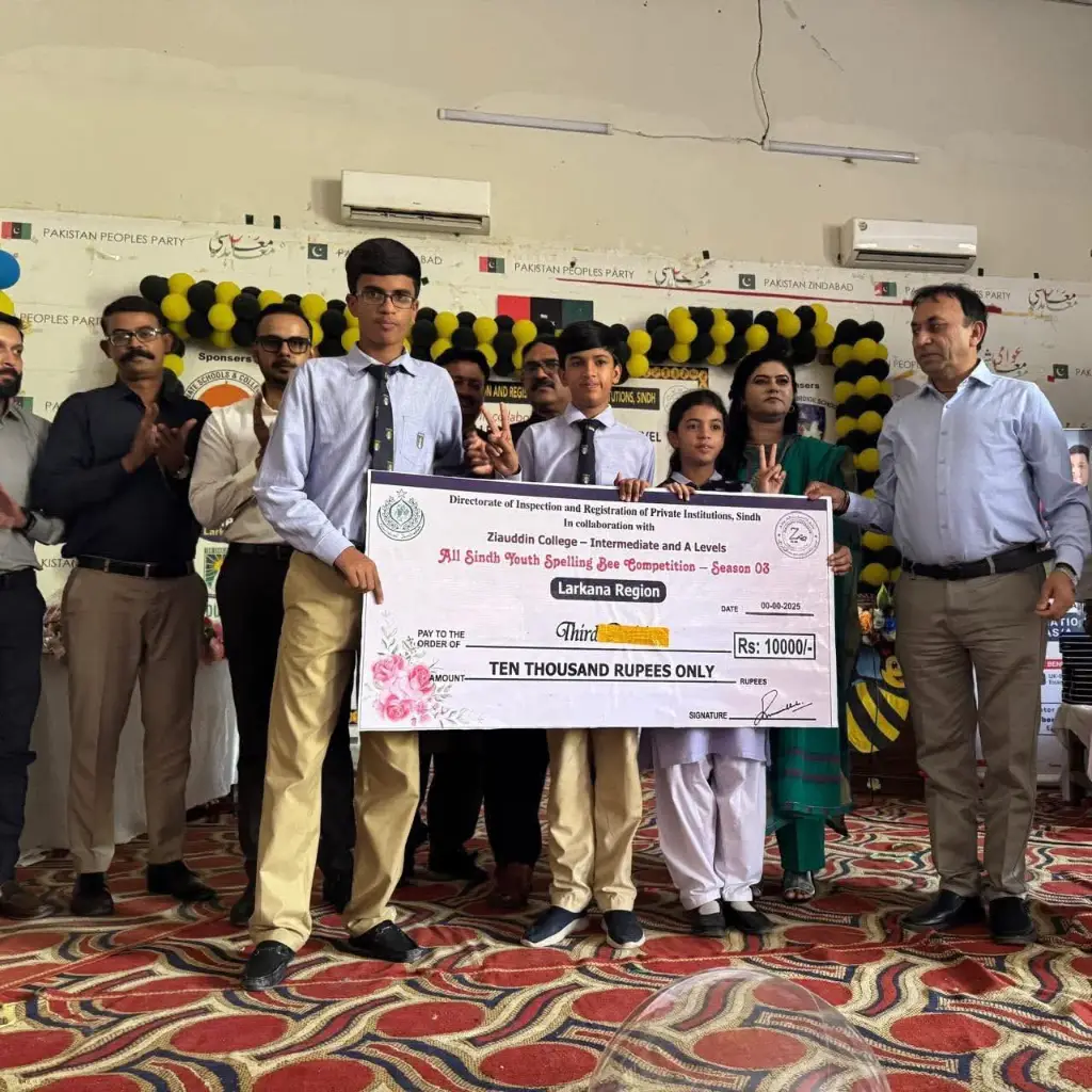 Ziauddin College – Intermediate and A Levels, in collaboration with the Directorate of Inspections and Registrations of Private Institutions Sindh, successfully hosted Day 05 of the All Sindh Youth Spelling Bee Competition – Season 03 on Tuesday, October 14, 2025, at Begum Nusrat Bhutto Hall, Larkana, for the Larkana Region.